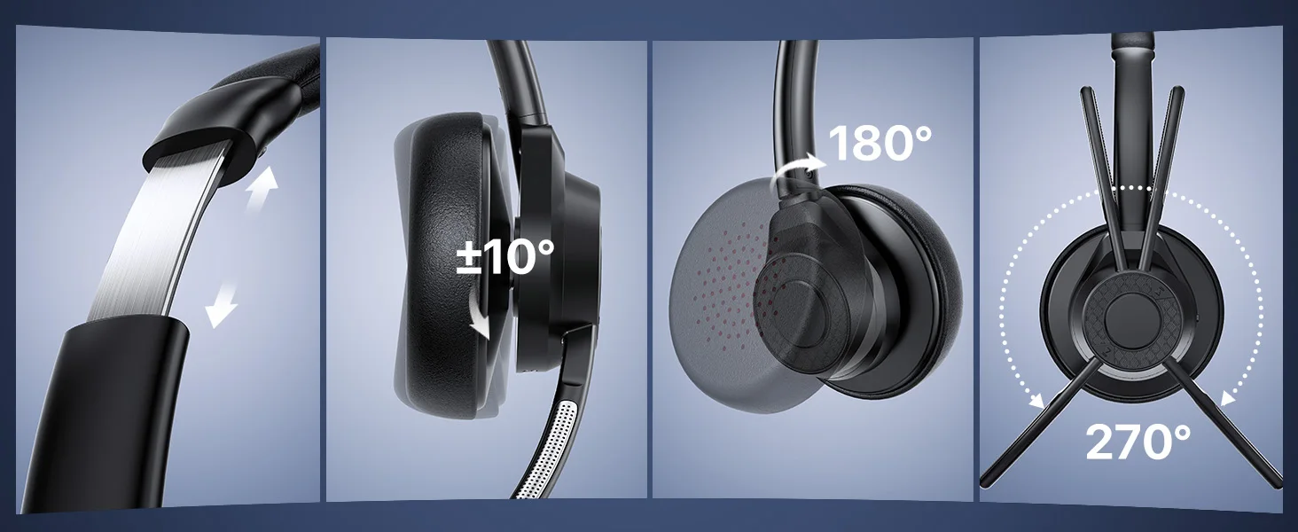 - Weighing just 144g (5 oz), this headset with mic offers unparalleled comfort for all-day use. The soft ear cushions, adjustable padded headband, and 270° rotatable microphone allow you to customize your fit while ensuring clear sound on either ear. Perfect for professionals, students, and anyone who values comfort during long hours of use.