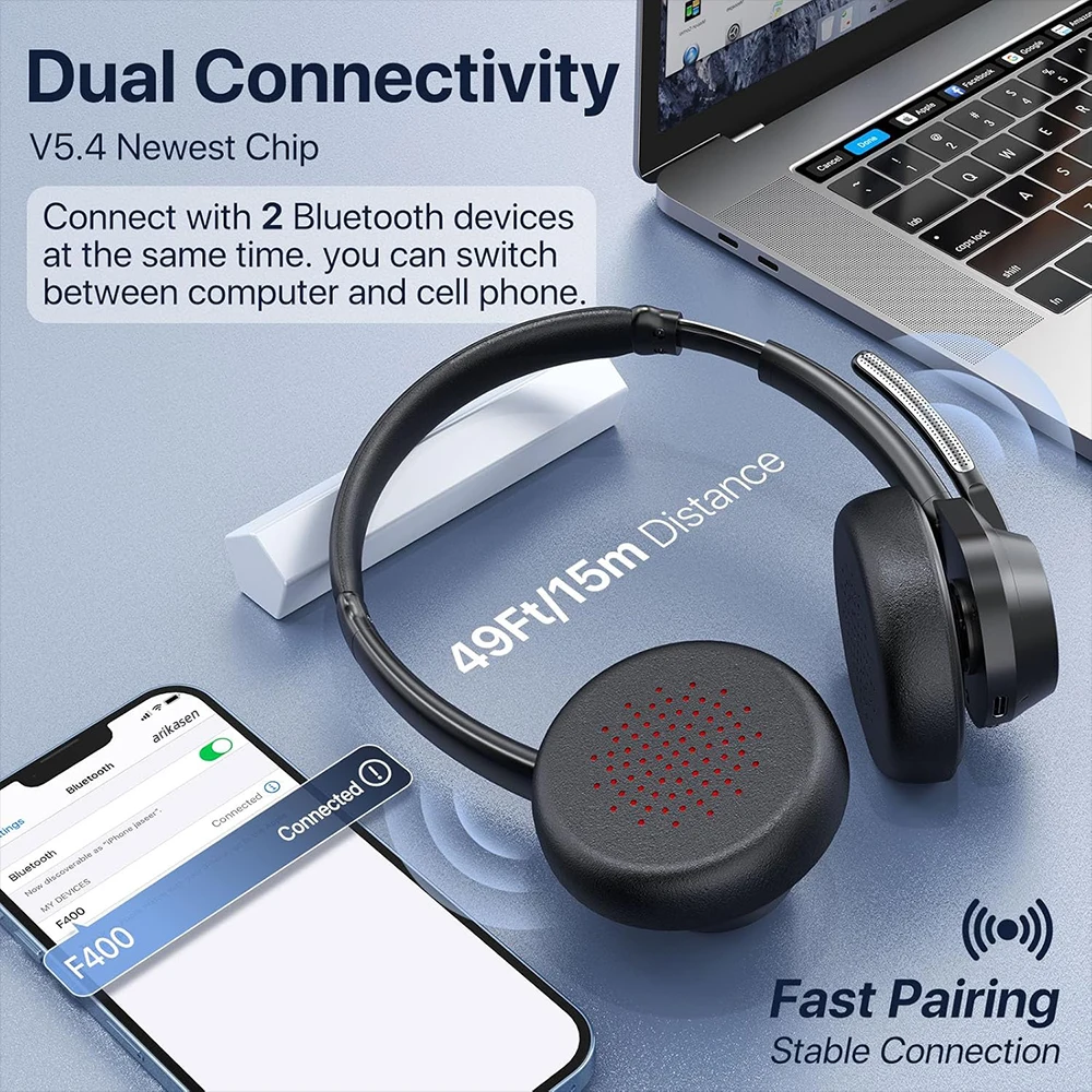 - Quickly connect this wireless bluetooth headset to your laptop, Mac, or mobile device via Bluetooth—no extra accessories needed. With Bluetooth multipoint technology, you can connect to two devices simultaneously and seamlessly switch between your laptop and phone, so you won't miss any important connections. The 15m (49 ft) wireless range gives you the freedom to move around your home or office without losing connection.