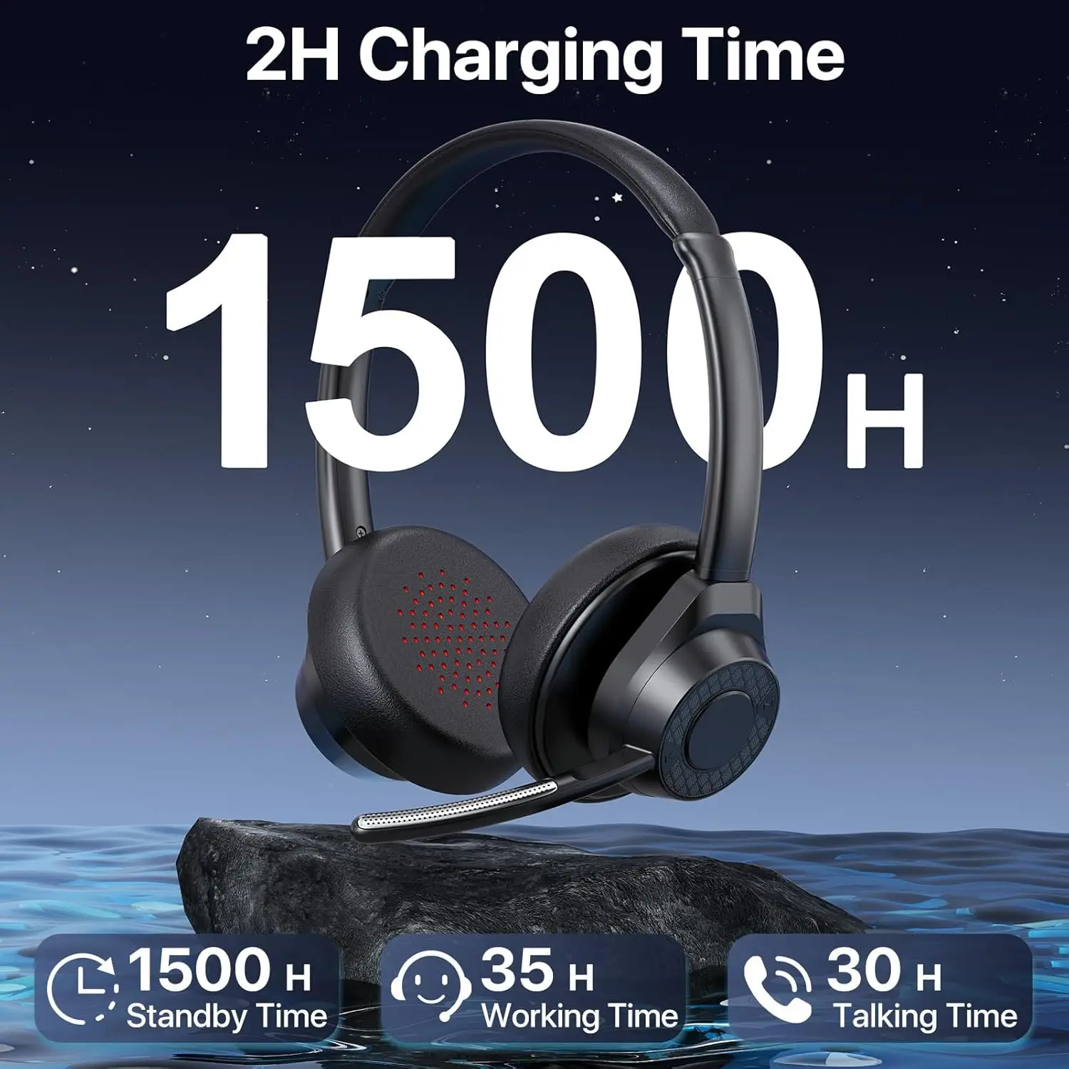 - Enjoy up to 35 hours of listening time and 30 hours of talk time on just a 2-hour charge with this wireless bluetooth headset. With long standby time exceeding two months, bluetooth headset is perfect for busy professionals, students, and frequent travelers. Eliminate battery anxiety and stay productive with one of the most reliable bluetooth headphones with mic.