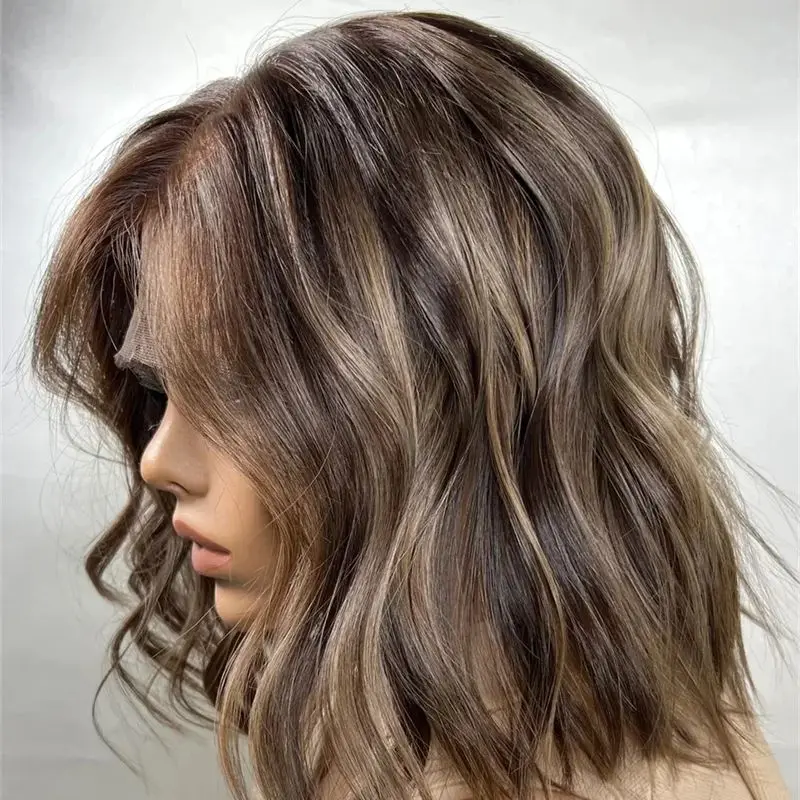 Water wave Human Hair Wig Short Bob Lace wig Medium Brown Natural Blonde Highlights Lace Frontal Wigs Glueless East to Wear